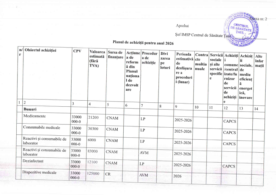 Plan de achiziții Planul de achiziții pentru anul 2026 Planul achizitiilor 2025 IMSP CS Țaul Plan de achiziții IMSP CS Taul 2024 Planul de achizitii pe anul 2023 IMSP CS Taul Plan de achizitii 2022 IMSP CS Taul